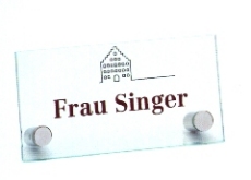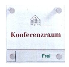 Stand. Durch die Konstruktion der Abstandhalter wird bei der Befestigung das Glas so zusammengepresst, dass sowohl eine Wellung der Einlegefolie, wie auch der Eintritt von Staub verhindert wird. Außerdem wird so ein unbefugter Zugriff auf den Beschriftungsträger vermieden. Die Variante der mechanischen Belegt/Frei-Anzeige rundet die Vielfalt der Türschilder ab. |