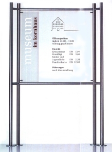 Sollte keine Wandmontage möglich sein, bietet das System Galerie eine Variante die extravagant und trotzdem schlicht die Informationen dort weitergibt, wo sie benötigt werden. Die Decken- Bodenverspannung eines Haupt- oder Etagenwegweisers ist eine stilvollen Alternative zur Wandbefestigung. Auch hier sind beide Beschriftungsvarianten möglich. |